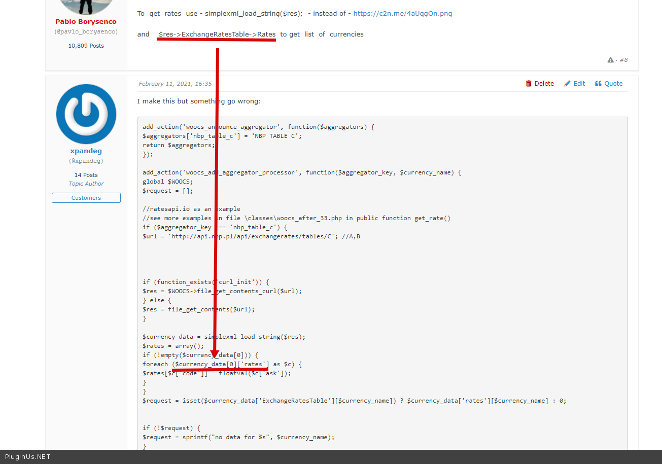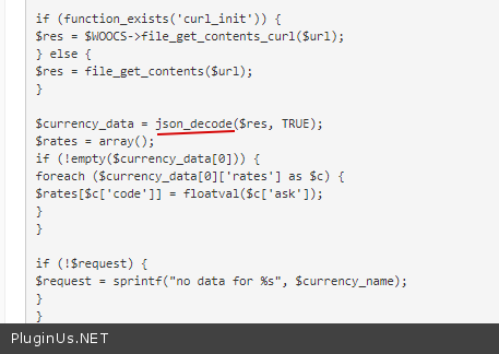 My code is:add_action('woocs_announce_aggregator', function($aggregators) { $aggregators['nbp_table_c'] = 'NBP TABLE C'; return $aggregators; }); add_action('woocs_add_aggregator_processor', function($aggregator_key, $currency_name) { global $WOOCS; $request = []; //ratesapi.io as an example //see more examples in file \classes\woocs_after_33.php in public function get_rate() if ($aggregator_key === 'nbp_table_c') { $url = 'http://api.nbp.pl/api/exchangerates/tables/C'; //A,B if (function_exists('curl_init')) { $res = $WOOCS->file_get_contents_curl($url); } else { $res = file_get_contents($url); } $currency_data = json_decode($res, TRUE); $rates = array(); if (!empty($currency_data[0])) { foreach ($currency_data[0]['rates'] as $c) { $rates[$c['code']] = floatval($c['ask']); } } if (!$request) { $request = sprintf("no data for %s", $currency_name); } } return $request; }, 10, 2);