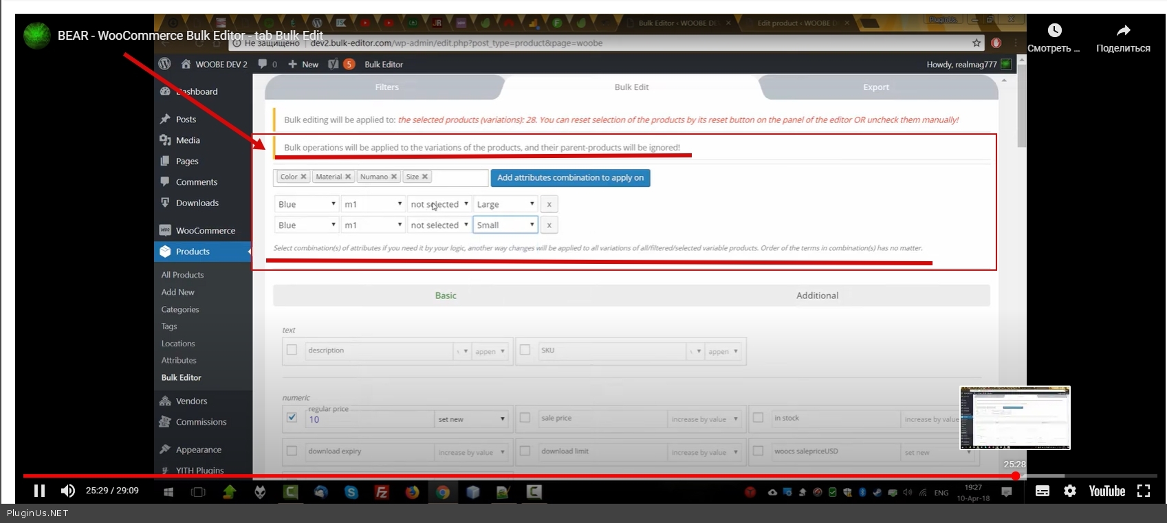 The video is very hard to follow and doesn't help at all. I have filtered by the variable i want to change (2.5l), selected the variables from the list, clicked Bulk Edit, ticked the 'regular price' checkbox, entered 50 and set to 'set new' then clicked on the bulk edit button. not only does it fail half way through, but it applies the price change to all variables (150ml and 750ml as well).