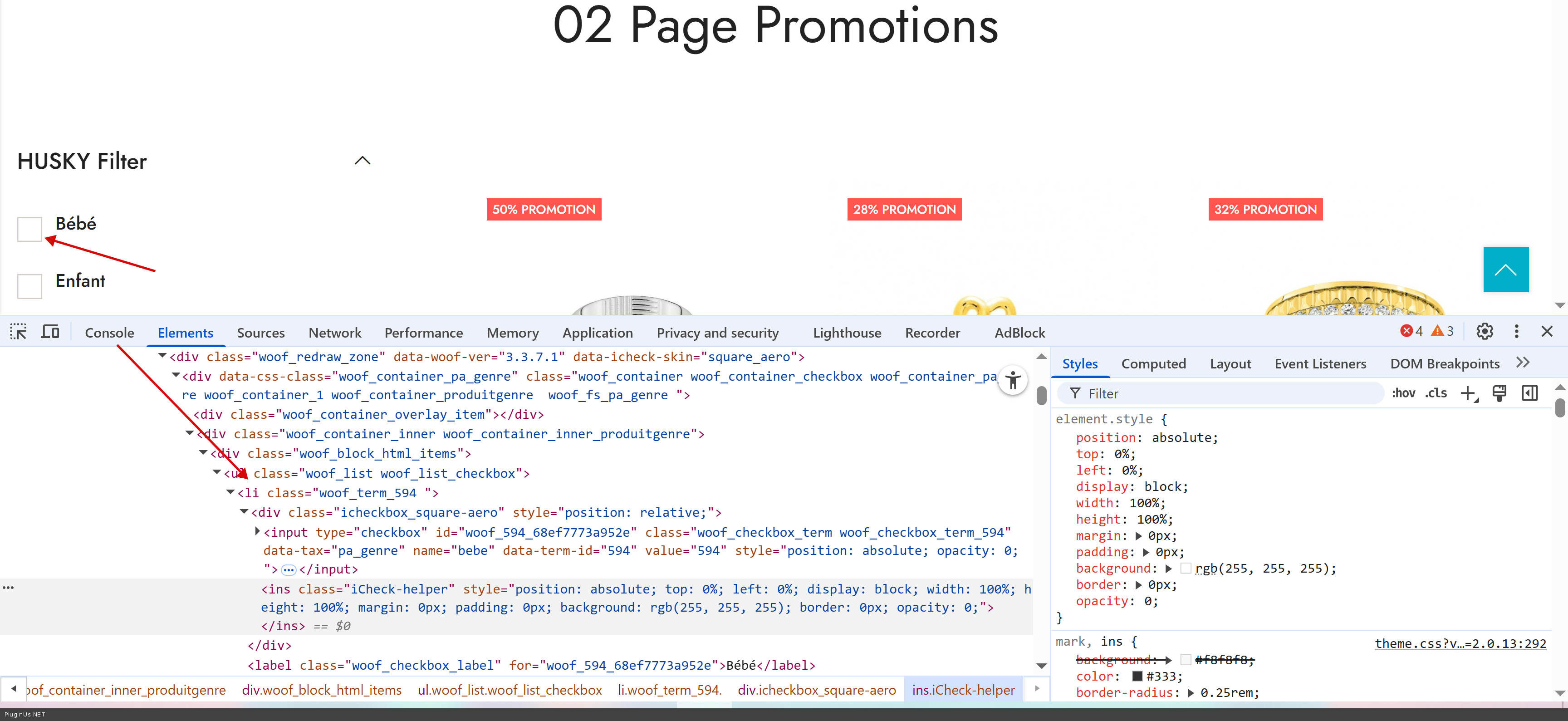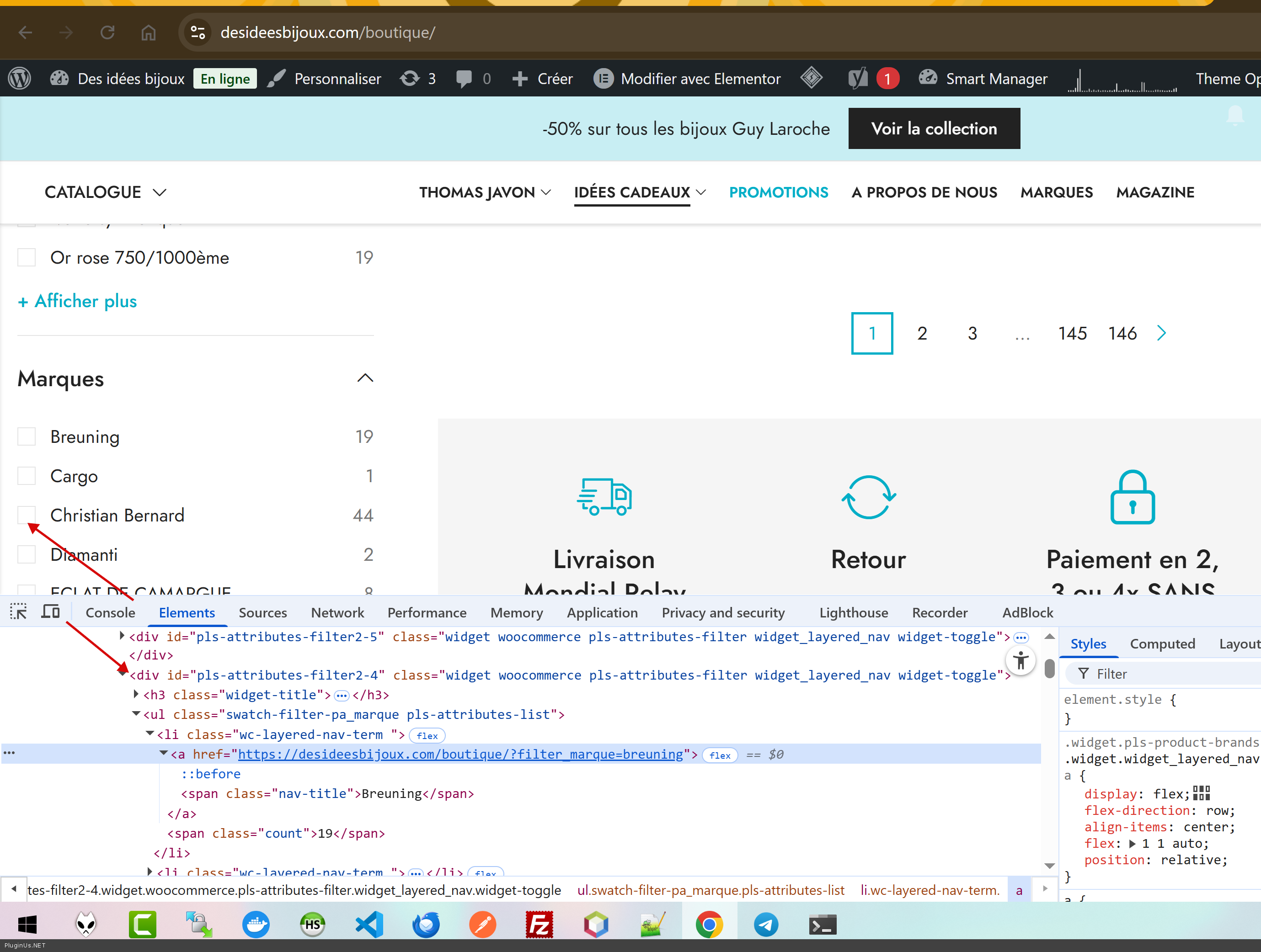 Quote from JDcl on October 14, 2025, 22:09Hello, I have a WooCommerce site with a store, and I have filters on the store's sidebar. I'd like my "Promotions" page to have exactly the same presentation of the filters, with the same titles, buttons, colors, etc., but after several adjustments, I can't seem to get it to look the same. Can you please tell me what settings I need and where I need to make them so that it looks as similar as possible? Here is the store page as an example: https://desideesbijoux.com/boutique/