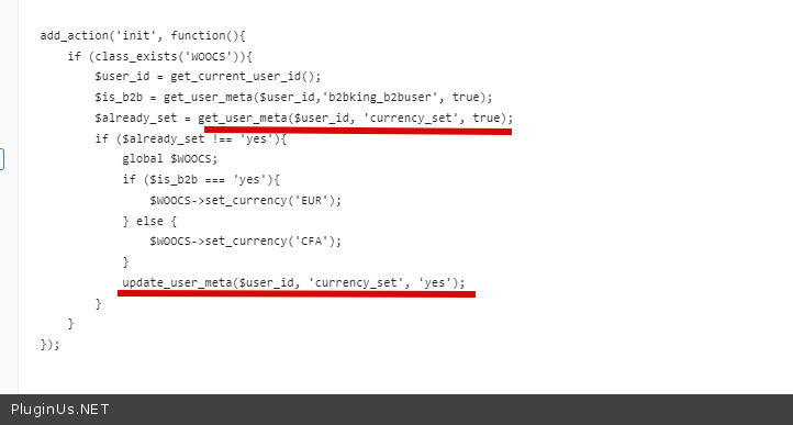 add_action('init', function(){ if (class_exists('WOOCS')){ $user_id = get_current_user_id(); $is_b2b = get_user_meta($user_id,'b2bking_b2buser', true); $already_set = get_user_meta($user_id, 'currency_set', true); if ($already_set !== 'yes'){ global $WOOCS; if ($is_b2b === 'yes'){ $WOOCS->set_currency('EUR'); } else { $WOOCS->set_currency('CFA'); } update_user_meta($user_id, 'currency_set', 'yes'); } } });