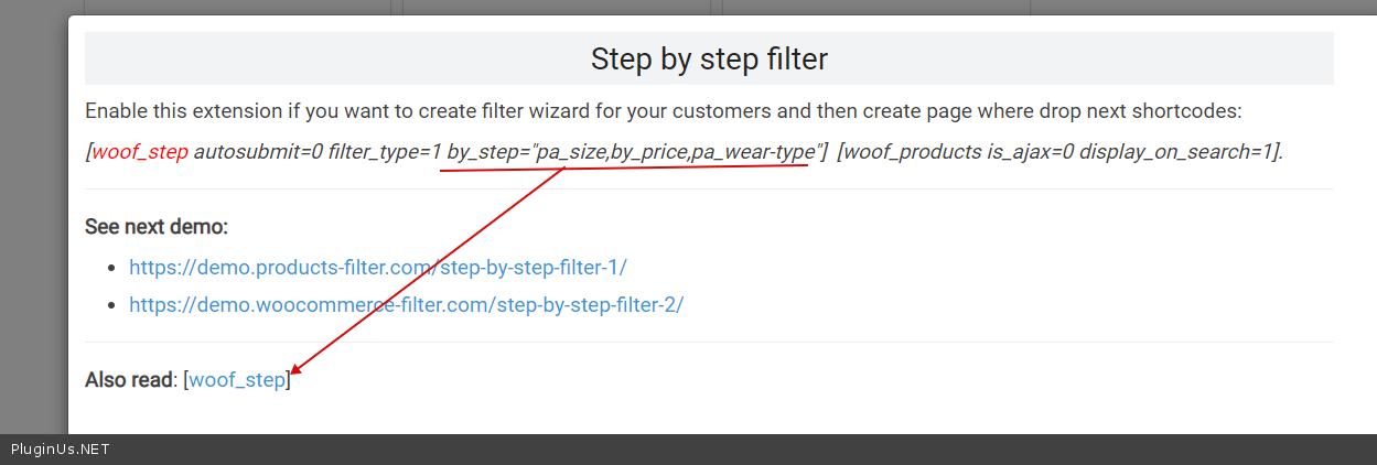thanks for the reply. In this line of shortcode [woof_step autosubmit=0 filter_type=1 by_step="pa_size,by_price,pa_wear-type"] [woof_products is_ajax=0 display_on_search=1]. What would I put there if I'm using product attributes? where does the pa_ come from?