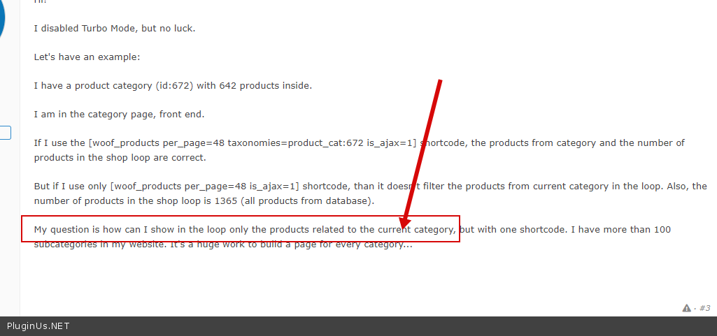 But if I use only [woof_products per_page=48 is_ajax=1] shortcode, than it doesn't filter the products from current category in the loop. Also, the number of products in the shop loop is 1365 (all products from database).
