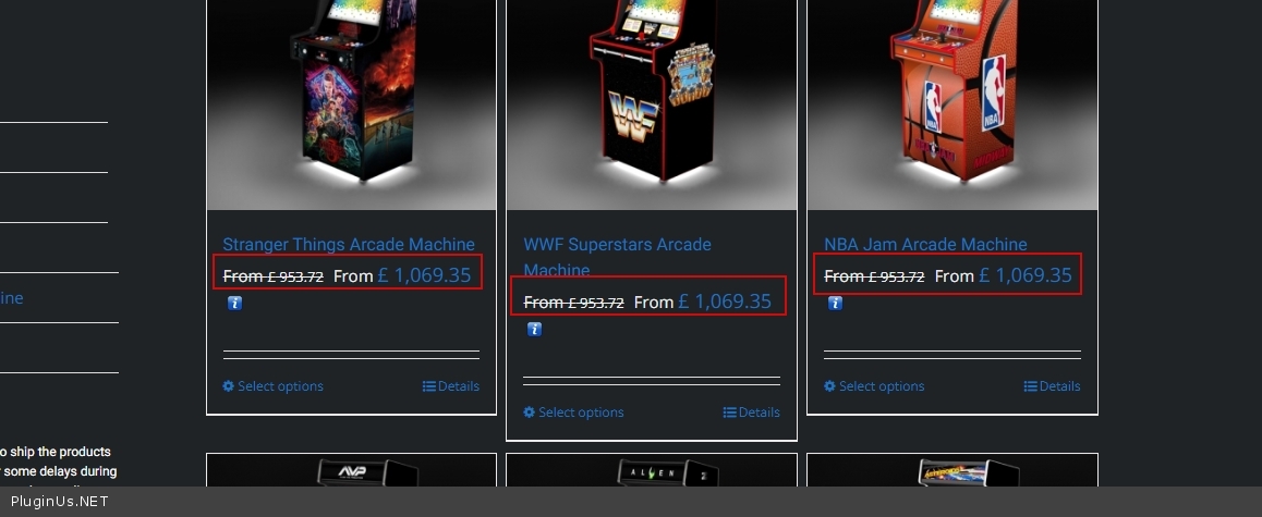 The price in pounds with discount (ex: From £ 953.72 From £ 1,069.35) is displayed incorrectly but only in pounds, in $ and EUR is displayed correctly and only in products with variable prices.