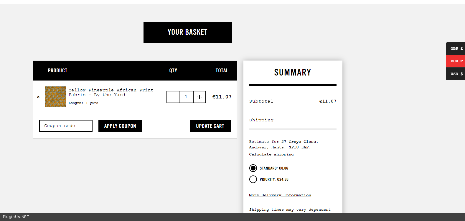 - The Euro prices are not showing on all fabric product pages for the different length variations (1 to 6 yards) but when I add fabric items to my basket the correct product prices show in Euros on the basket and checkout pages.