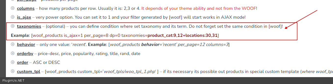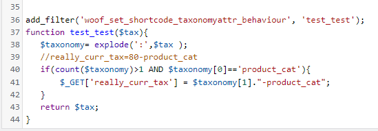 add_filter('woof_set_shortcode_taxonomyattr_behaviour', 'test_test');function test_test($tax){$taxonomy= explode(':',$tax );//really_curr_tax=80-product_catif(count($taxonomy)>1 AND $taxonomy[0]=='product_cat'){$_GET['really_curr_tax'] = $taxonomy[1]."-product_cat";}return $tax;}