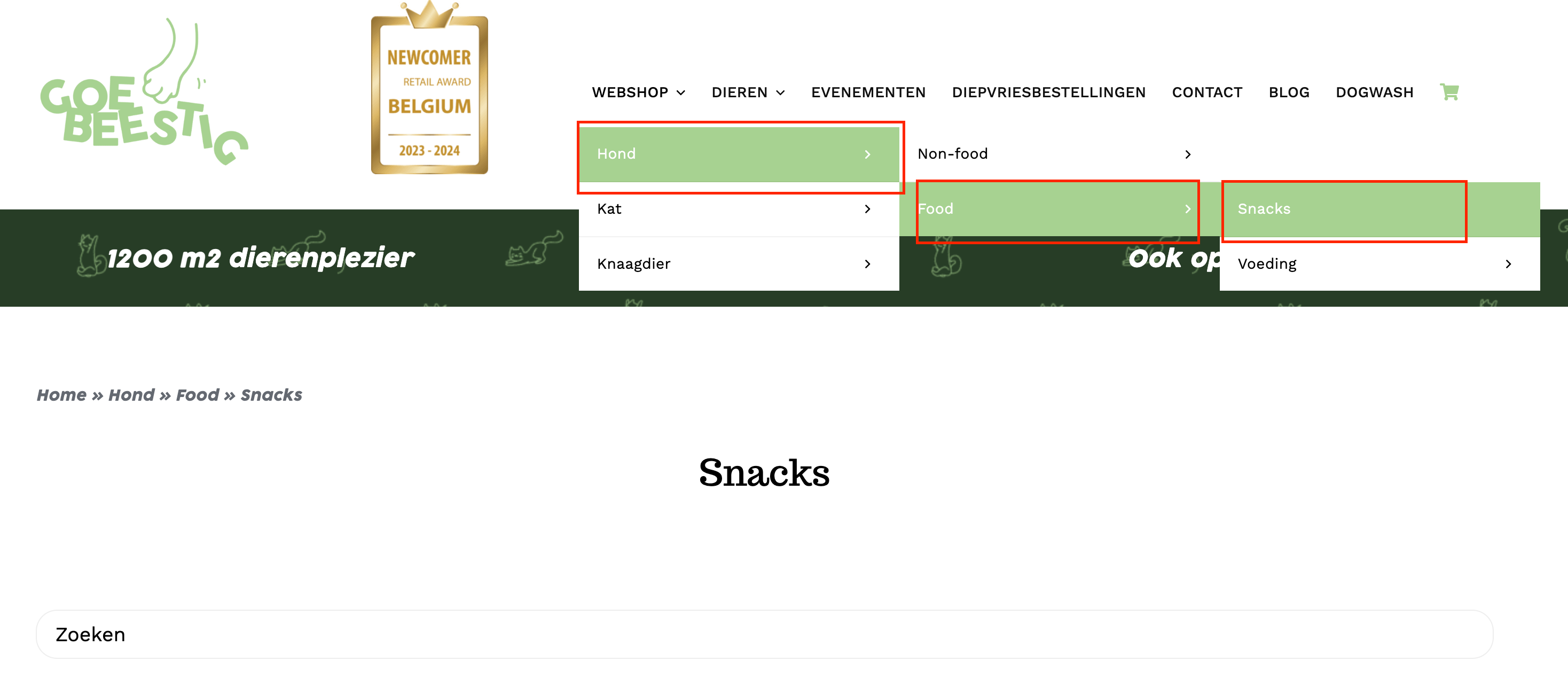 When I go to Dog (hond) > Food, I can select the Snacks child category in the filter manually. This is what needs to happen when I select the category in the menu on top of the website in my opinion.