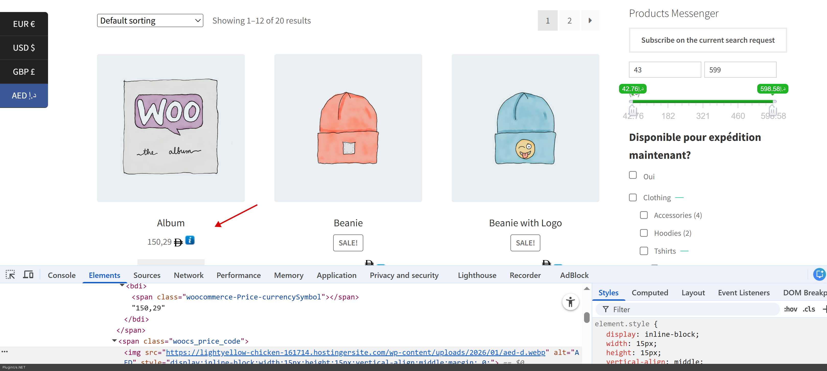add_filter('woocs_price_html', function($price_html) { global $WOOCS; if (isset($WOOCS) && $WOOCS->current_currency === 'AED') { $image = '<img src="https://lightyellow-chicken-161714.hostingersite.com/wp-content/uploads/2026/01/aed-d.webp" alt="AED" style="display:inline-block; width:15px; height:15px; vertical-align:middle;" />'; $price_html = str_replace('AED', $image, $price_html); $price_html = str_replace('د.إ', '', $price_html); } return $price_html; }, 10, 1); - Result: