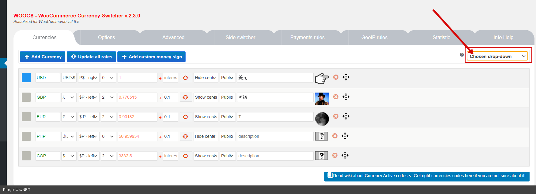 Но как я ранее написал - https://c2n.me/45BqfS4.png - для изменения переключателя в такой вид. Или создайте собственный шаблон- https://currency-switcher.com/how-to-create-currency-links-without-shortcode/