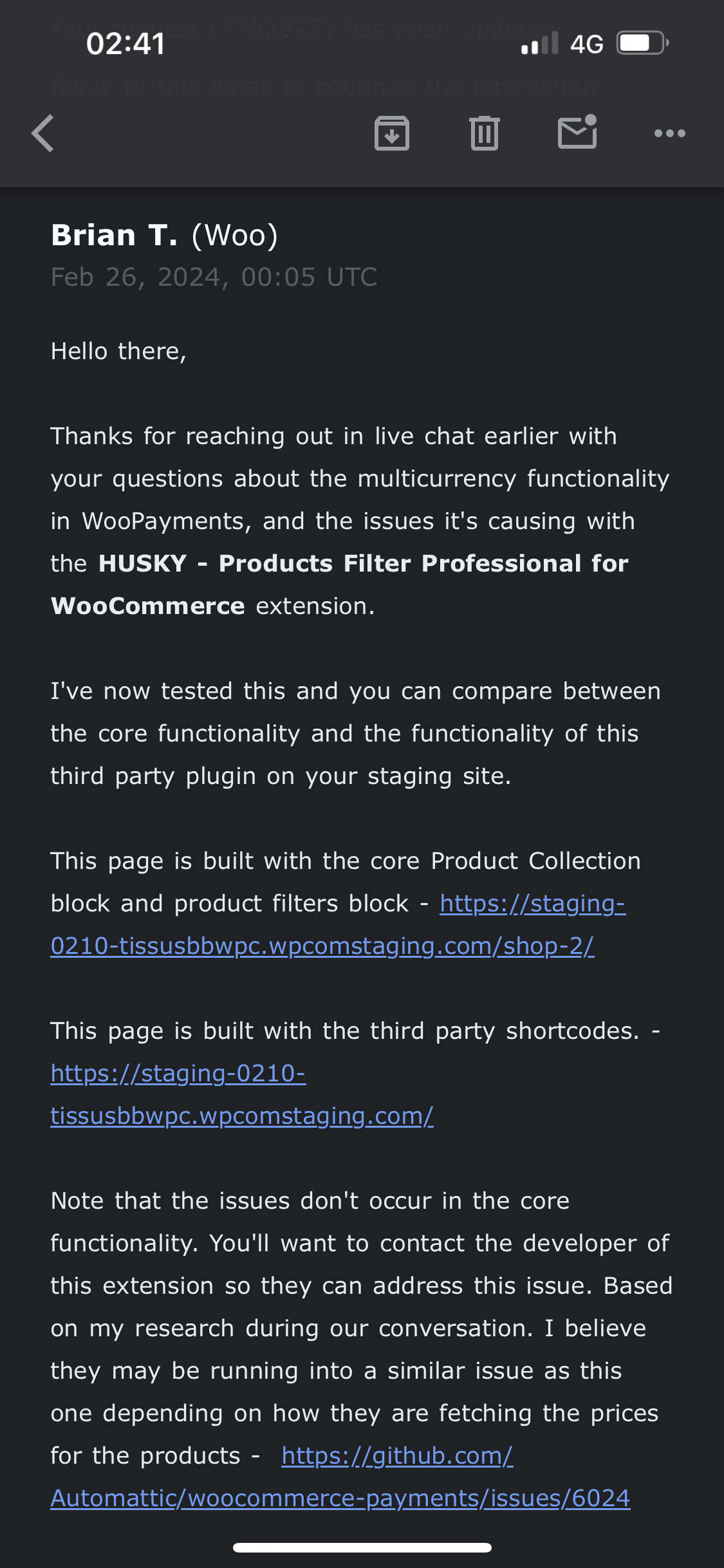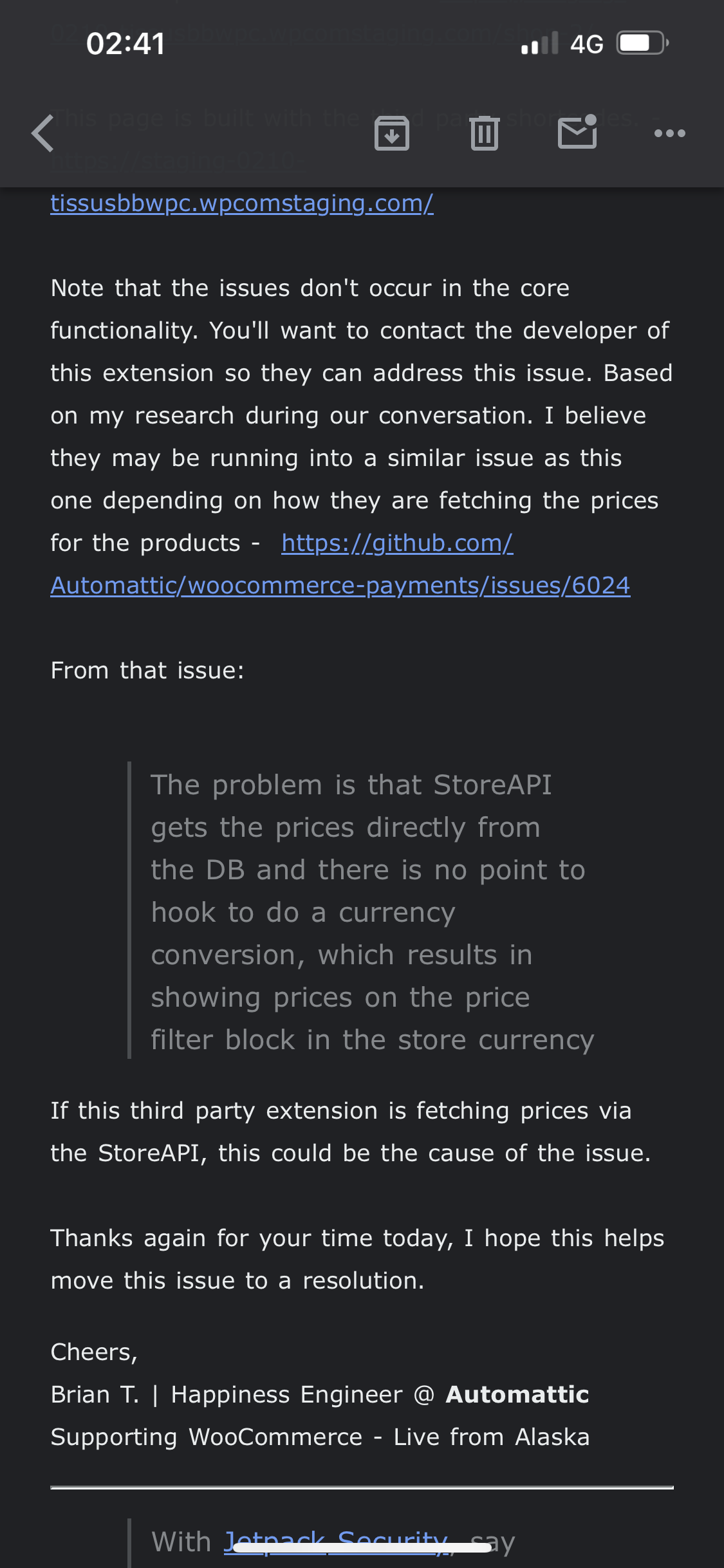 Thanks for reaching out in live chat earlier with your questions about the multicurrency functionality in WooPayments, and the issues it's causing with the HUSKY - Products Filter Professional for WooCommerce extension.