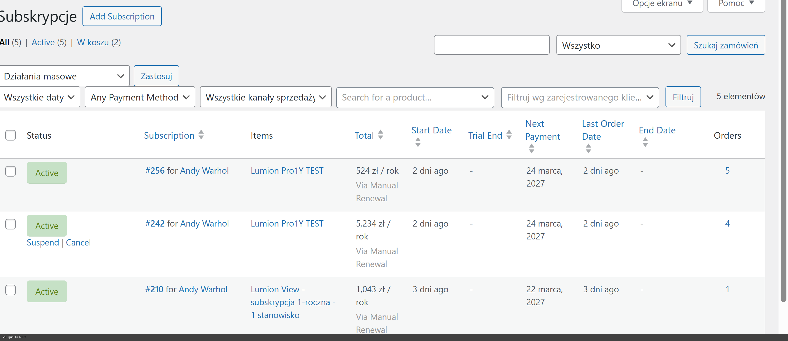 The issue: In the "Subscriptions" admin table, the total amounts are displayed using the customer's paid currency value (e.g., 524 PLN which includes VAT), but the currency symbol is forced to the store's base currency (e.g., 524 €).