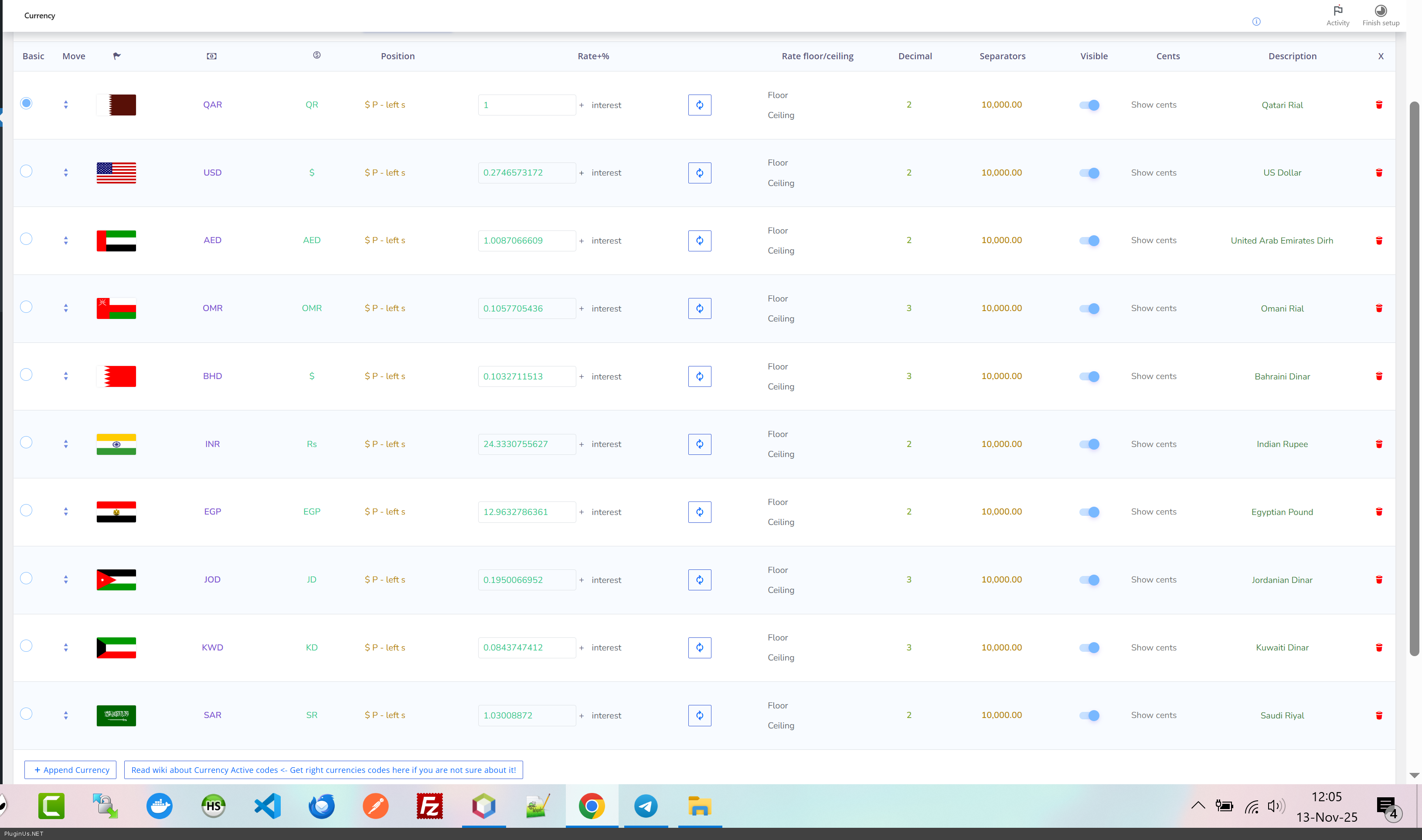 My base currency is BHD, and I have added several currencies including SAR, AED, KWD, QAR, and INR.