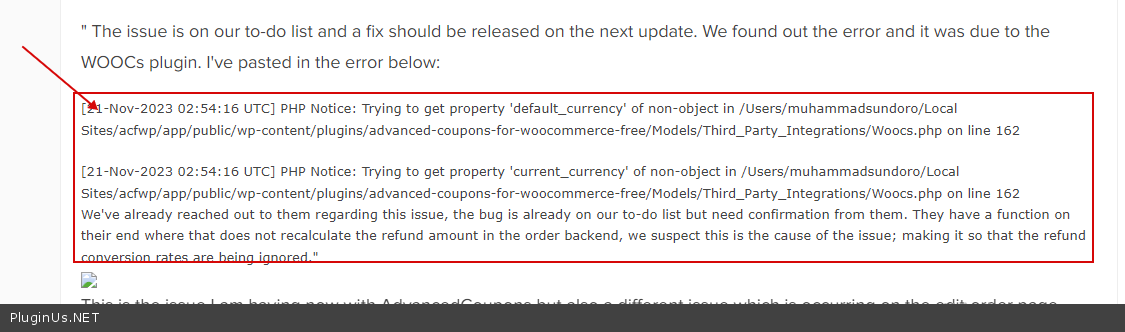 [21-Nov-2023 02:54:16 UTC] PHP Notice: Trying to get property 'default_currency' of non-object in /Users/muhammadsundoro/Local Sites/acfwp/app/public/wp-content/plugins/advanced-coupons-for-woocommerce-free/Models/Third_Party_Integrations/Woocs.php on line 162[21-Nov-2023 02:54:16 UTC] PHP Notice: Trying to get property 'current_currency' of non-object in /Users/muhammadsundoro/Local Sites/acfwp/app/public/wp-content/plugins/advanced-coupons-for-woocommerce-free/Models/Third_Party_Integrations/Woocs.php on line 162We've already reached out to them regarding this issue, the bug is already on our to-do list but need confirmation from them. They have a function on their end where that does not recalculate the refund amount in the order backend, we suspect this is the cause of the issue; making it so that the refund conversion rates are being ignored."This is the issue I am having now with AdvancedCoupons but also a different issue which is occurring on the edit-order page when using WPLoyalty which also is about this currency conversion.