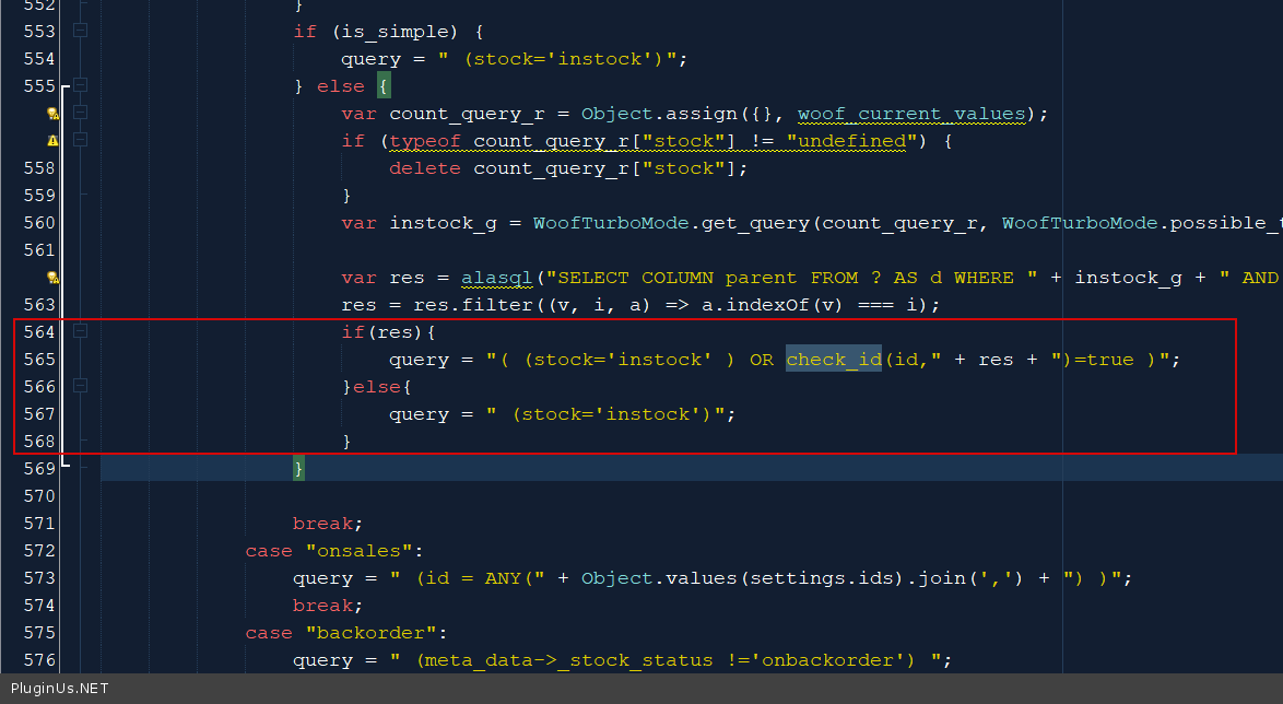 query ="( (stock='instock' ) OR check_id(id," + res +")=true )";