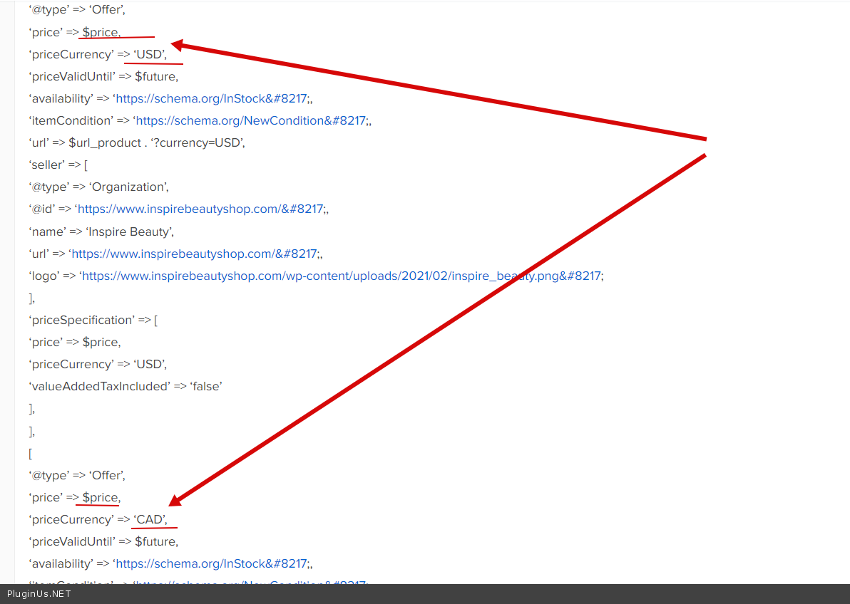 add_filter( 'rank_math/snippet/rich_snippet_product_entity', function( $entity ) {if ( ! is_product() ) {return $entity;}$product = wc_get_product( get_the_ID() );if ( ! $product->is_type( 'variable' ) ) {return $entity;}$variations = $product->get_available_variations();if ( ! empty( $variations ) ) {$offers = [];foreach ( $variations as $variation ) {$price_valid_until = get_post_meta( $variation['variation_id'], '_sale_price_dates_to', true );$offers[] = ['@type' => 'Offer','description' => strip_tags( $variation['variation_description'] ),'price' => $variation['display_price'],'priceCurrency' => get_woocommerce_currency(),'availability' => $variation['is_in_stock'] ? 'https://schema.org/InStock' : 'https://schema.org/OutOfStock','itemCondition' => 'NewCondition','priceValidUntil' => $price_valid_until ? date_i18n( 'Y-m-d', $price_valid_until ) : '2025-12-31','url' => $product->get_permalink(),'sku' => $variation['sku'],'gtin' => $variation['gtin'],];}}$entity['offers'] = $offers;return $entity;} );// fix for google merchant centre crawlers picking up wrong currency for cad vs usd pages// Based on source: https://support.rankmath.com/ticket/is-it-possible-to-set-multi-currencies-in-one-schema-in-a-woocommerce-product/function ssc_schema_dual_offers( $entity ) {global $product;if (class_exists('WOOCS')) {global $WOOCS;$curr = $WOOCS->current_currency;if($curr!=$WOOCS->default_currency){$WOOCS->reset_currency();}}$price = $product->get_price();$price_usd = $price;$price_cad = $price;if (class_exists('WOOCS')) {$currencies = $WOOCS->get_currencies();if(isset($currencies['USD'])){$price_usd = $price_usd * $currencies['USD']['rate'];}if(isset($currencies['CAD'])){$price_cad = $price_cad * $currencies['CAD']['rate'];}}$url_product = get_permalink( $product->get_id() );$future = date("Y-m-d", strtotime("+365 days"));//if ( has_term( 'example-category', 'product_cat' ) ) { // (We have it limited to only one category in our store)unset($entity['offers']);$entity['offers'] = [['@type' => 'Offer','price' => $price_usd,'priceCurrency' => 'USD','priceValidUntil' => $future,'availability' => 'https://schema.org/InStock','itemCondition' => 'https://schema.org/NewCondition','url' => $url_product . '?currency=USD','seller' => ['@type' => 'Organization','@id' => 'https://www.inspirebeautyshop.com/','name' => 'Inspire Beauty','url' => 'https://www.inspirebeautyshop.com/','logo' => 'https://www.inspirebeautyshop.com/wp-content/uploads/2021/02/inspire_beauty.png'],'priceSpecification' => ['price' => $price_usd,'priceCurrency' => 'USD','valueAddedTaxIncluded' => 'false'],],['@type' => 'Offer','price' => $price_cad,'priceCurrency' => 'CAD','priceValidUntil' => $future,'availability' => 'https://schema.org/InStock','itemCondition' => 'https://schema.org/NewCondition','url' => $url_product . '?currency=CAD','seller' => ['@type' => 'Organization','@id' => 'https://www.inspirebeautyshop.com/','name' => 'Inspire Beauty','url' => 'https://www.inspirebeautyshop.com/','logo' => 'https://www.inspirebeautyshop.com/wp-content/uploads/2021/02/inspire_beauty.png'],'priceSpecification' => ['price' => $price_cad,'priceCurrency' => 'CAD','valueAddedTaxIncluded' => 'false'],],];if (class_exists('WOOCS')) {global $WOOCS;if($curr != $WOOCS->current_currency){$WOOCS->set_currency($curr);}}return $entity;//}};add_filter( 'rank_math/snippet/rich_snippet_product_entity', 'ssc_schema_dual_offers', 999, 2 );