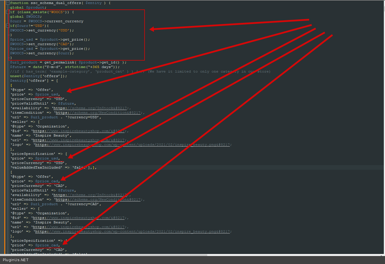 add_filter( 'rank_math/snippet/rich_snippet_product_entity', function( $entity ) {if ( ! is_product() ) {return $entity;}$product = wc_get_product( get_the_ID() );if ( ! $product->is_type( 'variable' ) ) {return $entity;}$variations = $product->get_available_variations();if ( ! empty( $variations ) ) {$offers = [];foreach ( $variations as $variation ) {$price_valid_until = get_post_meta( $variation['variation_id'], '_sale_price_dates_to', true );$offers[] = ['@type' => 'Offer','description' => strip_tags( $variation['variation_description'] ),'price' => $variation['display_price'],'priceCurrency' => get_woocommerce_currency(),'availability' => $variation['is_in_stock'] ? 'https://schema.org/InStock' : 'https://schema.org/OutOfStock','itemCondition' => 'NewCondition','priceValidUntil' => $price_valid_until ? date_i18n( 'Y-m-d', $price_valid_until ) : '2025-12-31','url' => $product->get_permalink(),'sku' => $variation['sku'],'gtin' => $variation['gtin'],];}}$entity['offers'] = $offers;return $entity;} );// fix for google merchant centre crawlers picking up wrong currency for cad vs usd pages// Based on source: https://support.rankmath.com/ticket/is-it-possible-to-set-multi-currencies-in-one-schema-in-a-woocommerce-product/function ssc_schema_dual_offers( $entity ) {global $product;if (class_exists('WOOCS')) {global $WOOCS;$curr = $WOOCS->current_currency;if($curr!='USD'){$WOOCS->set_currency('USD');}$price_usd = $product->get_price();$WOOCS->set_currency('CAD');$price_cad = $product->get_price();$WOOCS->set_currency($curr);}$url_product = get_permalink( $product->get_id() );$future = date("Y-m-d", strtotime("+365 days"));//if ( has_term( 'example-category', 'product_cat' ) ) { // (We have it limited to only one category in our store)unset($entity['offers']);$entity['offers'] = [['@type' => 'Offer','price' => $price_usd,'priceCurrency' => 'USD','priceValidUntil' => $future,'availability' => 'https://schema.org/InStock','itemCondition' => 'https://schema.org/NewCondition','url' => $url_product . '?currency=USD','seller' => ['@type' => 'Organization','@id' => 'https://www.inspirebeautyshop.com/','name' => 'Inspire Beauty','url' => 'https://www.inspirebeautyshop.com/','logo' => 'https://www.inspirebeautyshop.com/wp-content/uploads/2021/02/inspire_beauty.png'],'priceSpecification' => ['price' => $price_usd,'priceCurrency' => 'USD','valueAddedTaxIncluded' => 'false'],],['@type' => 'Offer','price' => $price_cad,'priceCurrency' => 'CAD','priceValidUntil' => $future,'availability' => 'https://schema.org/InStock','itemCondition' => 'https://schema.org/NewCondition','url' => $url_product . '?currency=CAD','seller' => ['@type' => 'Organization','@id' => 'https://www.inspirebeautyshop.com/','name' => 'Inspire Beauty','url' => 'https://www.inspirebeautyshop.com/','logo' => 'https://www.inspirebeautyshop.com/wp-content/uploads/2021/02/inspire_beauty.png'],'priceSpecification' => ['price' => $price_cad,'priceCurrency' => 'CAD','valueAddedTaxIncluded' => 'false'],],];return $entity;//}};add_filter( 'rank_math/snippet/rich_snippet_product_entity', 'ssc_schema_dual_offers', 999, 2 );