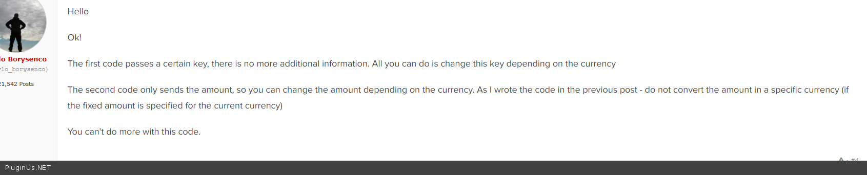 The second code only sends the amount, so you can change the amount depending on the currency. As I wrote the code in the previous post - do not convert the amount in a specific currency (if the fixed amount is specified for the current currency)