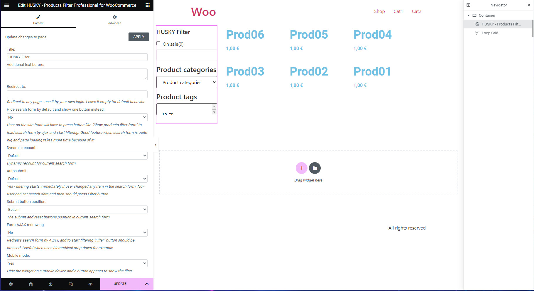 I use elementor loop greed and husky filter.How to make the button to open the filter appear in the mobile version?