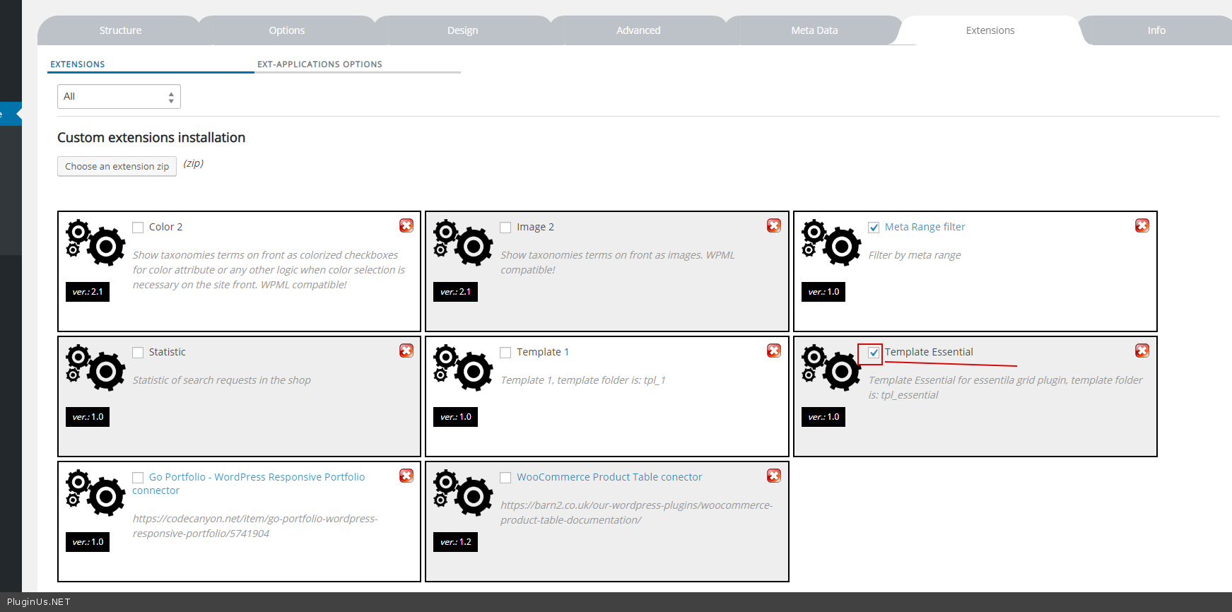 And there is no option showing like https://products-filter.com/extencion/essential-grid/ , like tab Extensions -> tab EXT-APPLICATIONS OPTIONS.