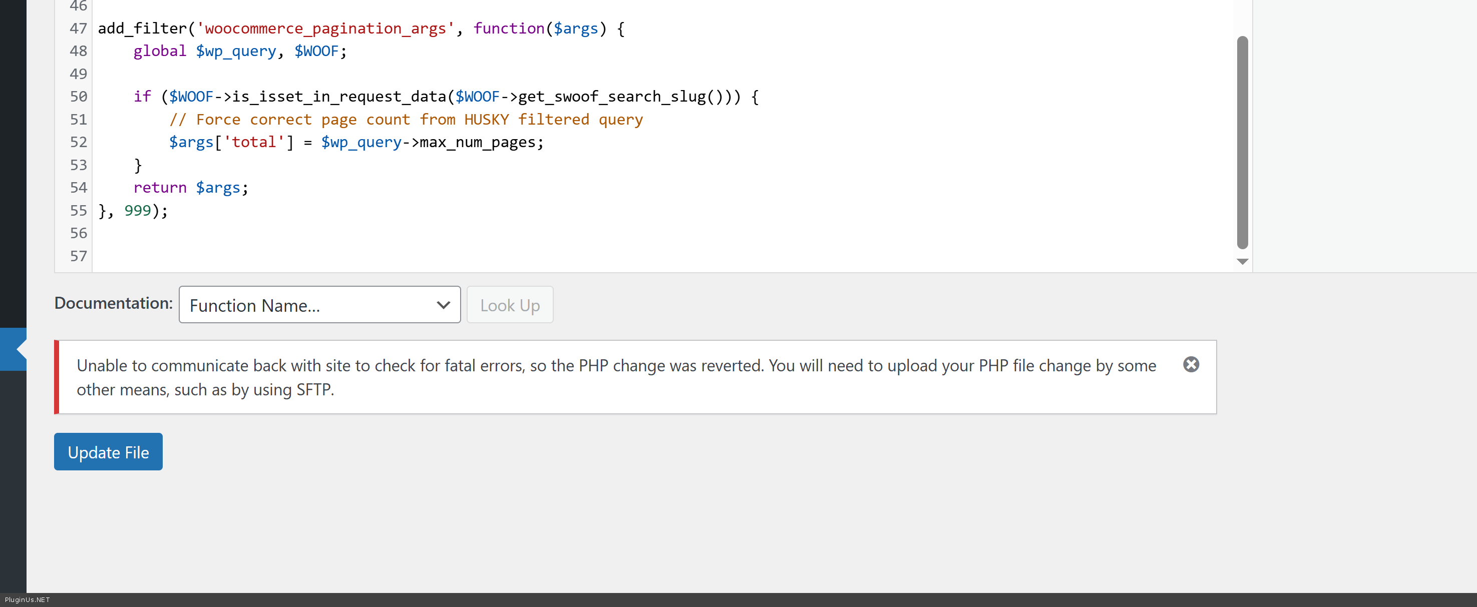 Unable to communicate back with site to check for fatal errors, so the PHP change was reverted. You will need to upload your PHP file change by some other means, such as by using SFTP.
