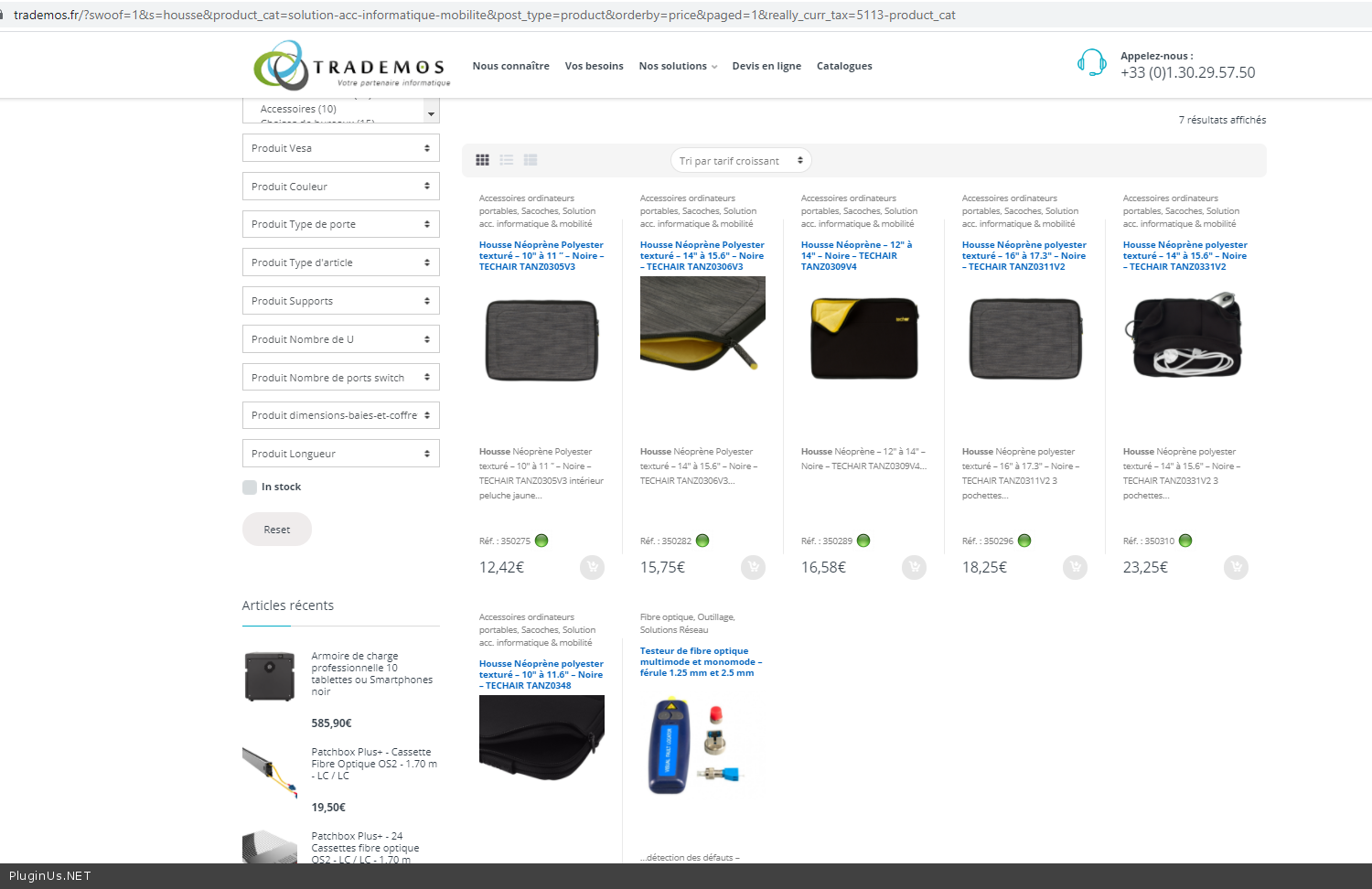 - Result : 7 same products sorted (https://www.trademos.fr/?s=housse&product_cat=solution-acc-informatique-mobilite&post_type=product&orderby=price&paged=1&really_curr_tax=5113-product_cat)