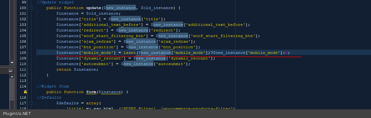 [error] 110412#110412: *886236 FastCGI sent in stderr: "PHP message: PHP Warning: Undefined array key "mobile_mode" in /www/thefibrecocom_930/public/wp-content/plugins/woocommerce-products-filter/classes/widgets.php on line 108PHP