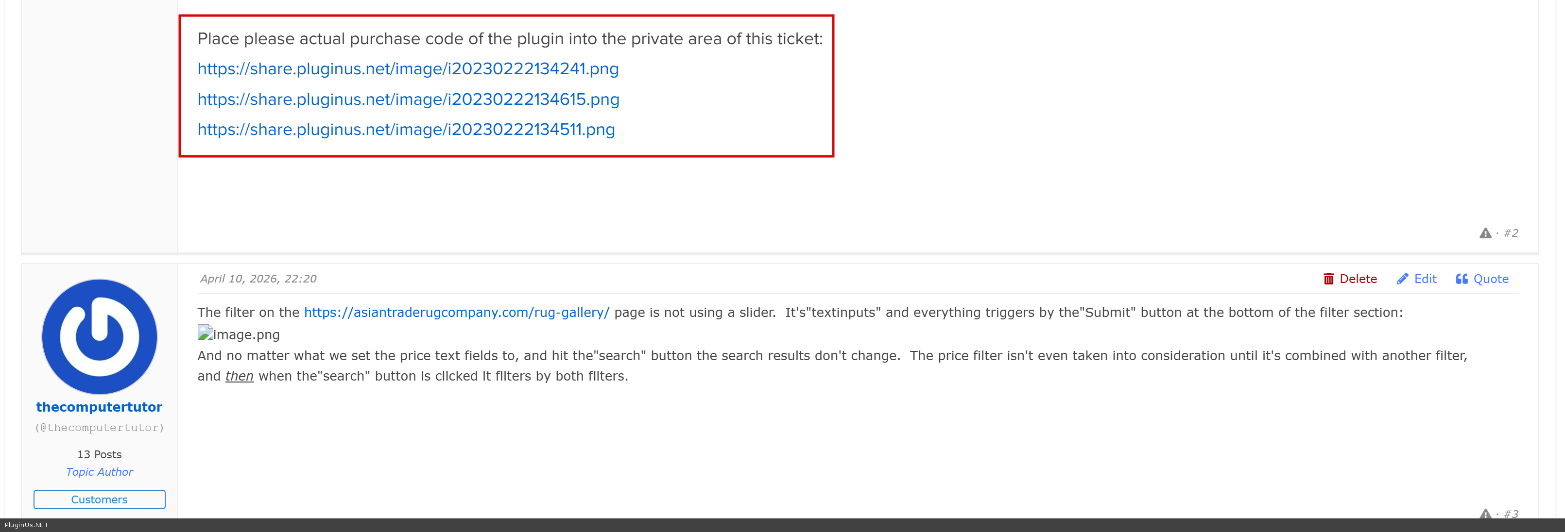 Quote from Alex Dovlatov on April 14, 2026, 12:00Place please actual purchase code of the plugin into the private area of this ticket:
