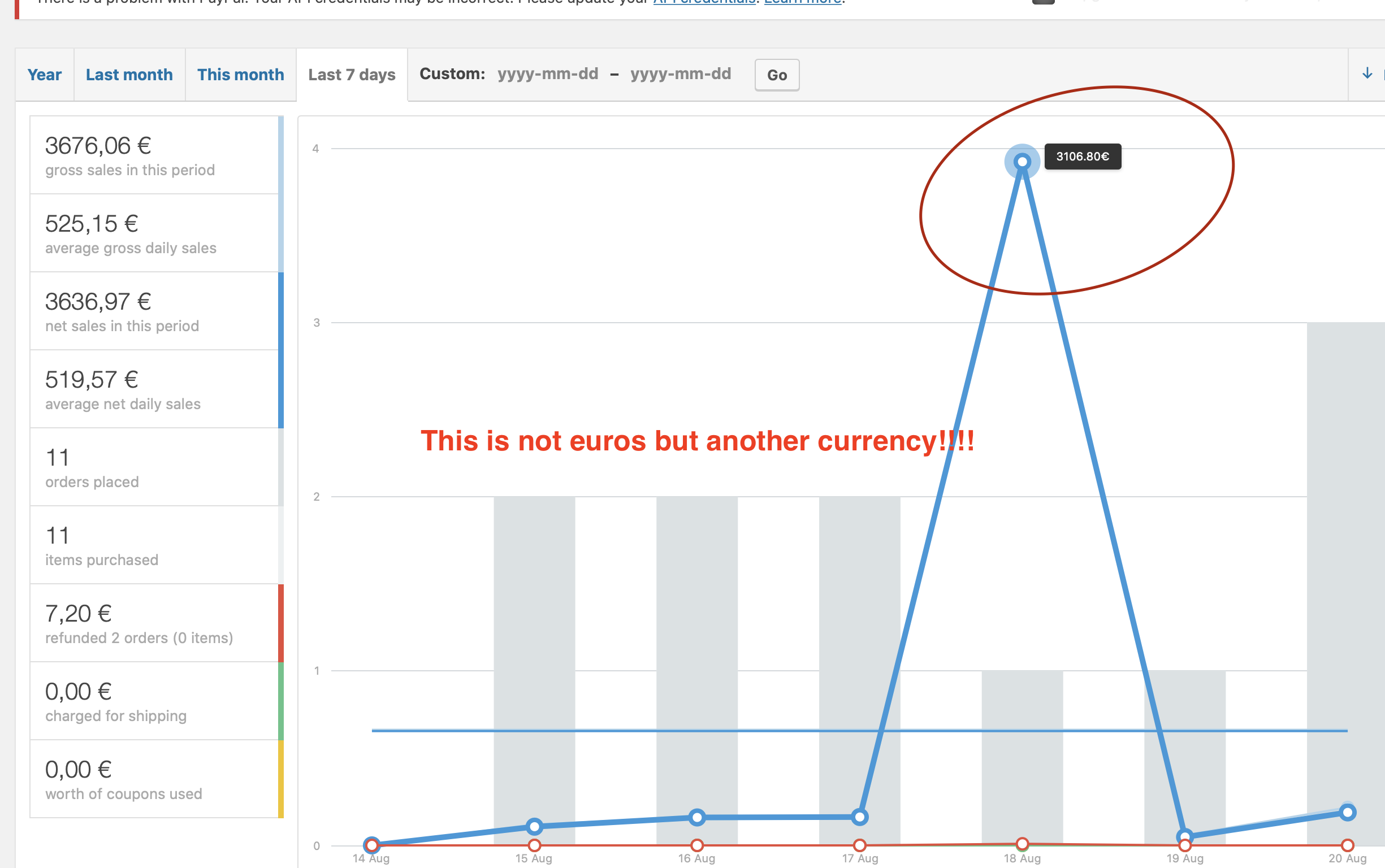 Their is a lot of bugs that I even not mentioned, like this one in the capture 1 (the info icon doesn't work as expected and not showing every conversion). The currency doesn't switch my subscription fee which we talked about previously (where you telling its cause of a third party plugin, which is not, as subscription is a plugin from Woocommerce!). And at the end, in the woocommerce itself it makes bug my reports that doesn't take in count the new currencies like the capture 2 (And here we are talking about WOOCOMMERCE plugin!!) so you understand here that it doesn't fit my business and that I will have to take another plugin.