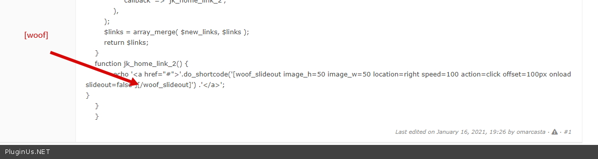 En mi archivo javascript tengo lo siguiente:var modal=document.getElementById("myModal"),btn=document.getElementById("myBtn"),span=document.getElementsByClassName("close")[0];btn.onclick=function(){modal.style.display="block"},span.onclick=function(){modal.style.display="none"},window.onclick=function(n){n.target==modal&&(modal.style.display="none")};Comento que la extensión "Slideout shortcode" propia de WOOF Filter la he instalado pero no se como agregar a un boton especifico de mi tema para que lo accione y abra los filtros con el shortcode. He intentado lo siguiente en functions.php de mi tema y tampoco funciona (muestra el boton pero nunca abre los filtros):add_action( 'wp', 'woofilterhook' );function woofilterhook() {if (is_shop() || is_product_category()) {add_filter( 'storefront_handheld_footer_bar_links', 'jk_add_home_link3' );function jk_add_home_link3( $links ) {$new_links = array('filtros' => array('priority' => 9,'callback' => 'jk_home_link_2',),);$links = array_merge( $new_links, $links );return $links;}function jk_home_link_2() {echo '<a href="#">'.do_shortcode('[woof_slideout image_h=50 image_w=50 location=right speed=100 action=click offset=100px onloadslideout=false ][/woof_slideout]') .'</a>';}}}