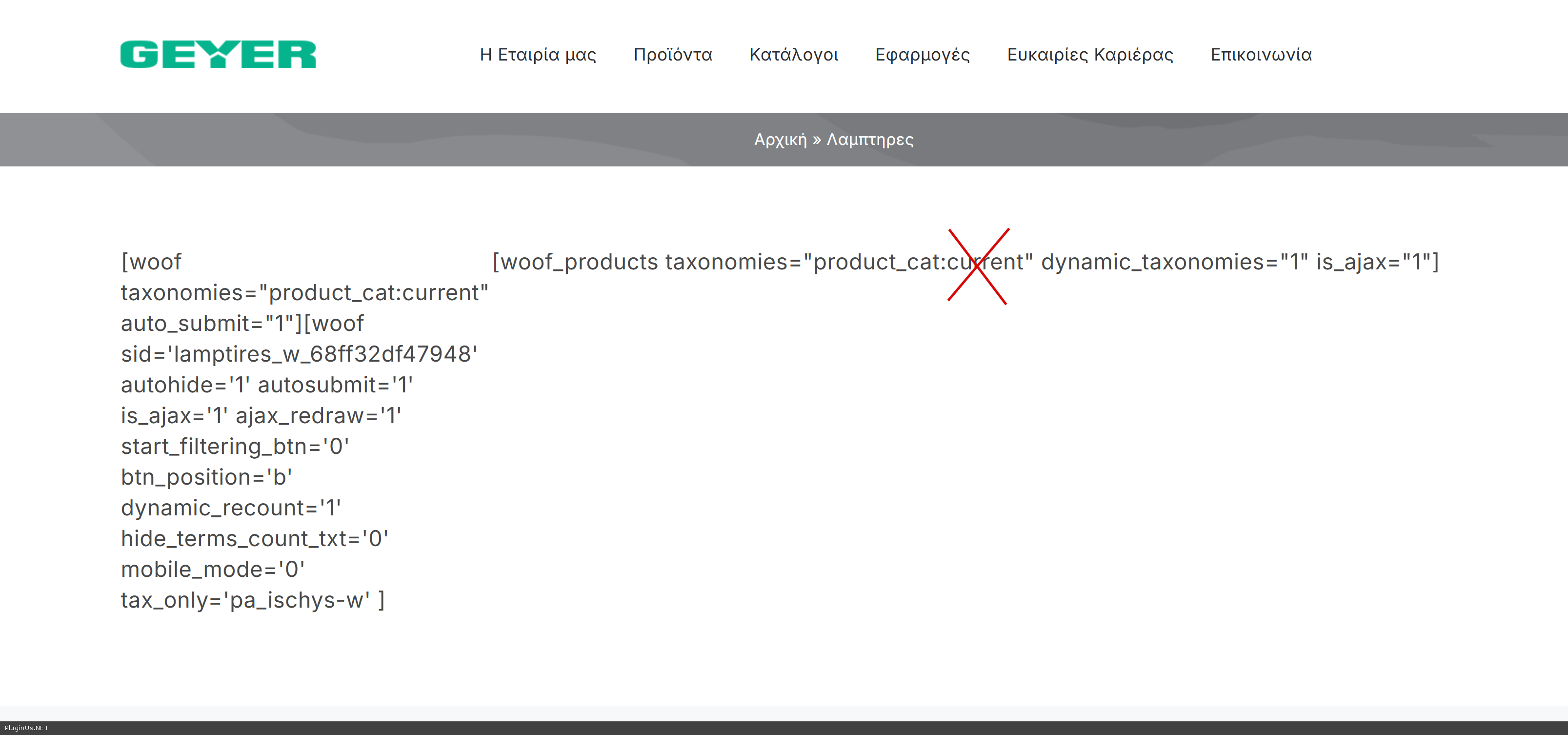 Quote from jalev on October 27, 2025, 13:02Hi here is a product category page https://staging.geyer.gr/cat/labtires/ (to see the page you have to login with the credentials I have given in the private data). The subcategories on the left side are correct as they are the subcategories of the parent category labtires (slug). The product on the right are not correct though as they are just all the products of the website.