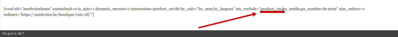 I write short-code: [woof sid="needvoicehome" autosubmit=0 is_ajax=1 dynamic_recount=1 taxonomies=product_cat:86 by_only="by_sexe,by_langues" tax_exclude="pa_media,pa_nombre-de-mots" ajax_redraw=1 redirect="https://needvoice.be/boutique/voix-off/"]