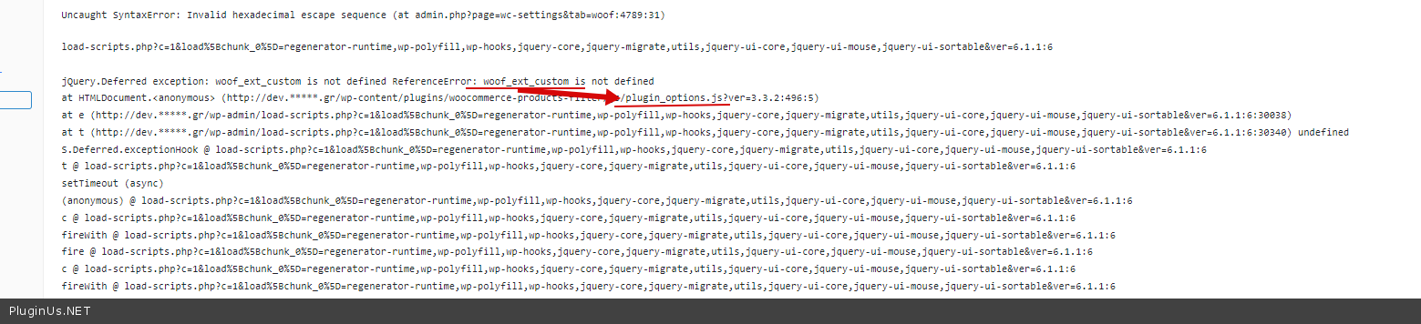 load-scripts.php?c=1&load%5Bchunk_0%5D=regenerator-runtime,wp-polyfill,wp-hooks,jquery-core,jquery-migrate,utils,jquery-ui-core,jquery-ui-mouse,jquery-ui-sortable&ver=6.1.1:6 jQuery.Deferred exception: woof_ext_custom is not defined ReferenceError: woof_ext_custom is not defined at HTMLDocument.<anonymous> (http://dev.*****.gr/wp-content/plugins/woocommerce-products-filter/js/plugin_options.js?ver=3.3.2:496:5) at e (http://dev.*****.gr/wp-admin/load-scripts.php?c=1&load%5Bchunk_0%5D=regenerator-runtime,wp-polyfill,wp-hooks,jquery-core,jquery-migrate,utils,jquery-ui-core,jquery-ui-mouse,jquery-ui-sortable&ver=6.1.1:6:30038) at t (http://dev.*****.gr/wp-admin/load-scripts.php?c=1&load%5Bchunk_0%5D=regenerator-runtime,wp-polyfill,wp-hooks,jquery-core,jquery-migrate,utils,jquery-ui-core,jquery-ui-mouse,jquery-ui-sortable&ver=6.1.1:6:30340) undefined S.Deferred.exceptionHook @ load-scripts.php?c=1&load%5Bchunk_0%5D=regenerator-runtime,wp-polyfill,wp-hooks,jquery-core,jquery-migrate,utils,jquery-ui-core,jquery-ui-mouse,jquery-ui-sortable&ver=6.1.1:6 t @ load-scripts.php?c=1&load%5Bchunk_0%5D=regenerator-runtime,wp-polyfill,wp-hooks,jquery-core,jquery-migrate,utils,jquery-ui-core,jquery-ui-mouse,jquery-ui-sortable&ver=6.1.1:6 setTimeout (async) (anonymous) @ load-scripts.php?c=1&load%5Bchunk_0%5D=regenerator-runtime,wp-polyfill,wp-hooks,jquery-core,jquery-migrate,utils,jquery-ui-core,jquery-ui-mouse,jquery-ui-sortable&ver=6.1.1:6 c @ load-scripts.php?c=1&load%5Bchunk_0%5D=regenerator-runtime,wp-polyfill,wp-hooks,jquery-core,jquery-migrate,utils,jquery-ui-core,jquery-ui-mouse,jquery-ui-sortable&ver=6.1.1:6 fireWith @ load-scripts.php?c=1&load%5Bchunk_0%5D=regenerator-runtime,wp-polyfill,wp-hooks,jquery-core,jquery-migrate,utils,jquery-ui-core,jquery-ui-mouse,jquery-ui-sortable&ver=6.1.1:6 fire @ load-scripts.php?c=1&load%5Bchunk_0%5D=regenerator-runtime,wp-polyfill,wp-hooks,jquery-core,jquery-migrate,utils,jquery-ui-core,jquery-ui-mouse,jquery-ui-sortable&ver=6.1.1:6 c @ load-scripts.php?c=1&load%5Bchunk_0%5D=regenerator-runtime,wp-polyfill,wp-hooks,jquery-core,jquery-migrate,utils,jquery-ui-core,jquery-ui-mouse,jquery-ui-sortable&ver=6.1.1:6 fireWith @ load-scripts.php?c=1&load%5Bchunk_0%5D=regenerator-runtime,wp-polyfill,wp-hooks,jquery-core,jquery-migrate,utils,jquery-ui-core,jquery-ui-mouse,jquery-ui-sortable&ver=6.1.1:6 ready @ load-scripts.php?c=1&load%5Bchunk_0%5D=regenerator-runtime,wp-polyfill,wp-hooks,jquery-core,jquery-migrate,utils,jquery-ui-core,jquery-ui-mouse,jquery-ui-sortable&ver=6.1.1:6 $ @ load-scripts.php?c=1&load%5Bchunk_0%5D=regenerator-runtime,wp-polyfill,wp-hooks,jquery-core,jquery-migrate,utils,jquery-ui-core,jquery-ui-mouse,jquery-ui-sortable&ver=6.1.1:6 load-scripts.php?c=1&load%5Bchunk_0%5D=regenerator-runtime,wp-polyfill,wp-hooks,jquery-core,jquery-migrate,utils,jquery-ui-core,jquery-ui-mouse,jquery-ui-sortable&ver=6.1.1:6 Uncaught ReferenceError: woof_ext_custom is not defined at HTMLDocument.<anonymous> (plugin_options.js?ver=3.3.2:496:5) at e (load-scripts.php?c=1&load%5Bchunk_0%5D=regenerator-runtime,wp-polyfill,wp-hooks,jquery-core,jquery-migrate,utils,jquery-ui-core,jquery-ui-mouse,jquery-ui-sortable&ver=6.1.1:6:30038) at t (load-scripts.php?c=1&load%5Bchunk_0%5D=regenerator-runtime,wp-polyfill,wp-hooks,jquery-core,jquery-migrate,utils,jquery-ui-core,jquery-ui-mouse,jquery-ui-sortable&ver=6.1.1:6:30340)