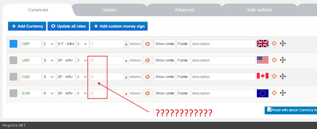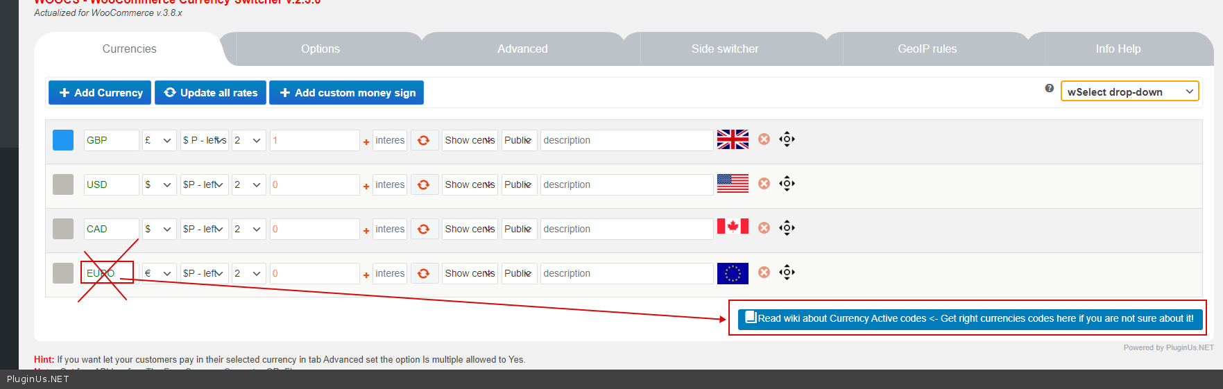 I have my plugin set up to change between GBP, USD, EURO & CAD. GBP is the default currency. I have European and Worldwide Shipping set at £7 & £9.