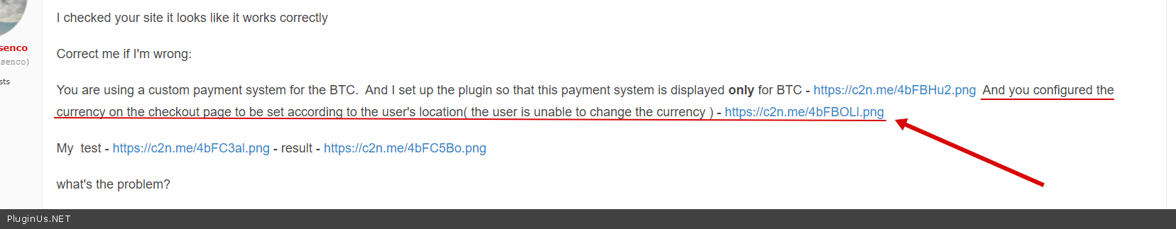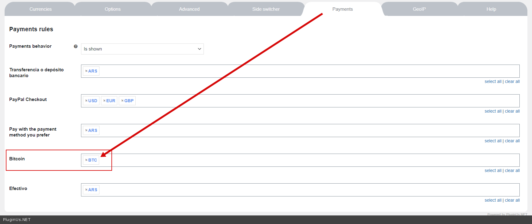 You are using a custom payment system for the BTC. And I set up the plugin so that this payment system is displayed only for BTC - https://c2n.me/4bFBHu2.png And you configured the currency on the checkout page to be set according to the user's location( the user is unable to change the currency ) - https://c2n.me/4bFBOLl.png