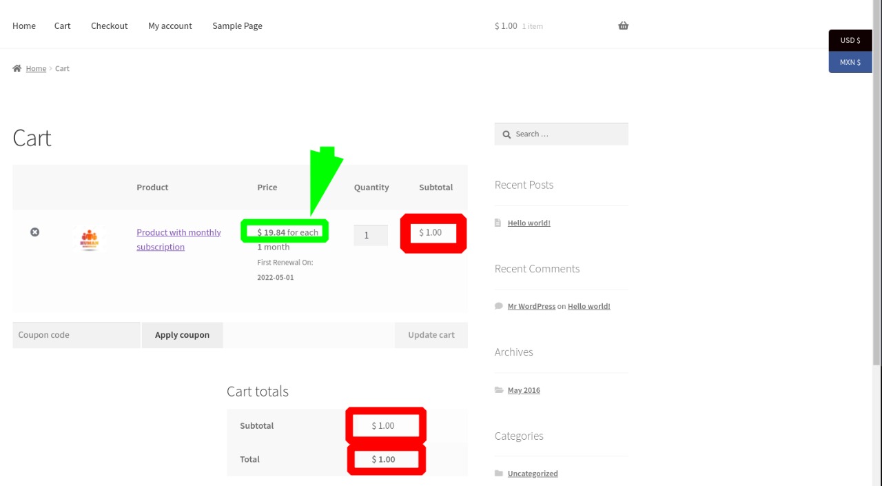- Switching to a different currency, for example, MXN: monthly fee MXN$501.75, this is CORRECT, and in the total amount it is displayed as MXN$10,070.12, this is INCORRECT, with next billing cycle 2022-4-25. The correct amount, should be MXN$501.75