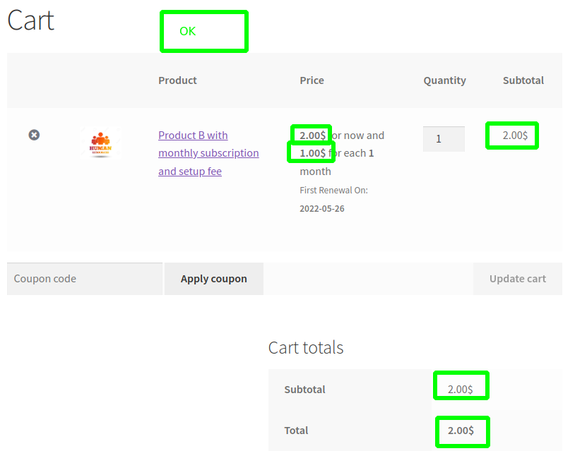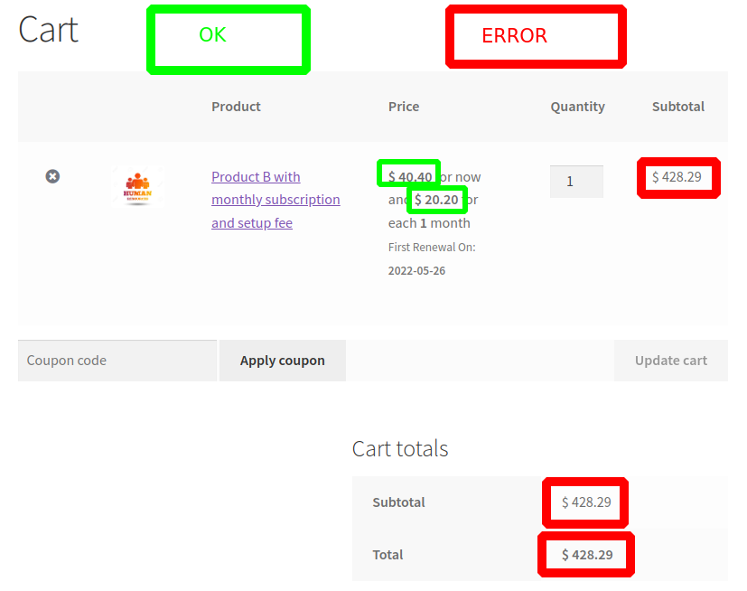 - Product B, is the same as Product A, but I have added a Signup Fee. This case fails. https://store.conectado.me/?product=product-with-monthly-subscription-and-setup-fee
