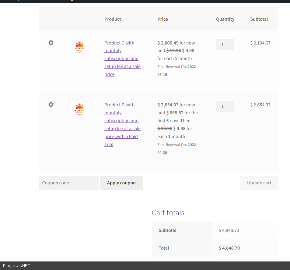 - Product C, is the same as Product B, but I have added a sale price. This case fails. https://store.conectado.me/?product=product-with-monthly-subscription-and-setup-fee-copy