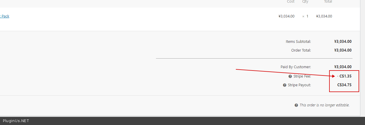 As you scroll down, you can see that this was charged in Japanese Yen, the customer’s local currency, but Stripe transferred the funds to me in CAD because my Stripe account default is Canadian dollars, so the $36.10 is CAD. The fee is also shown in CAD as $1.35, so my Net is CAD $34.75. WooCommerce calls this "Stripe Payout".