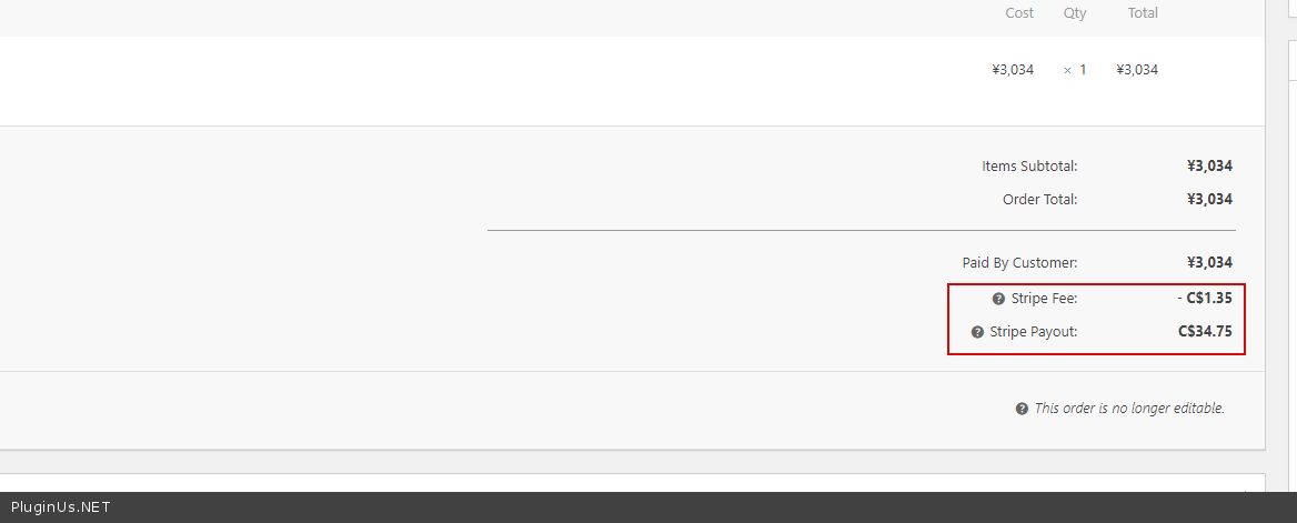 You can see that the Total is in agreement with Stripe, Y3,034, but the Stripe Fee is recorded here as -Y1. It should say -$1.35 (which is my default currency of CAD), so you can see that it was rounded down, and the Japanese Yen currency symbol was applied incorrectly. You can also see that the Stripe Payout is recorded here as Y35, but it should say $34.75 (CAD). You can see that this was rounded up because it mistakenly sees it as Japanese Yen which is a zero decimal currency.