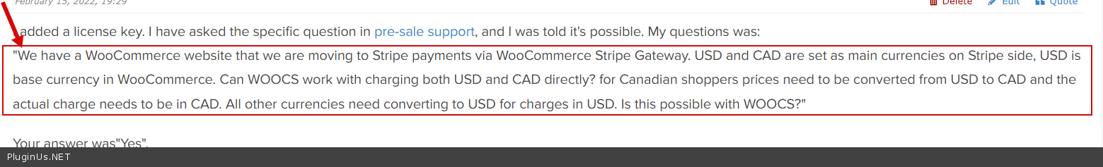 "We have a WooCommerce website that we are moving to Stripe payments via WooCommerce Stripe Gateway. USD and CAD are set as main currencies on Stripe side, USD is base currency in WooCommerce. Can WOOCS work with charging both USD and CAD directly? for Canadian shoppers prices need to be converted from USD to CAD and the actual charge needs to be in CAD. All other currencies need converting to USD for charges in USD. Is this possible with WOOCS?"Your answer was "Yes".
