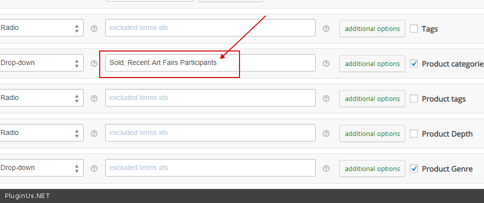 I tried to get my filter to show only some exact product categories using settings in product category section excluding taxonomies terms (in my case I don't want two categories to be visible there: sold, recent art fairs participants) And they are still pretty much visible.