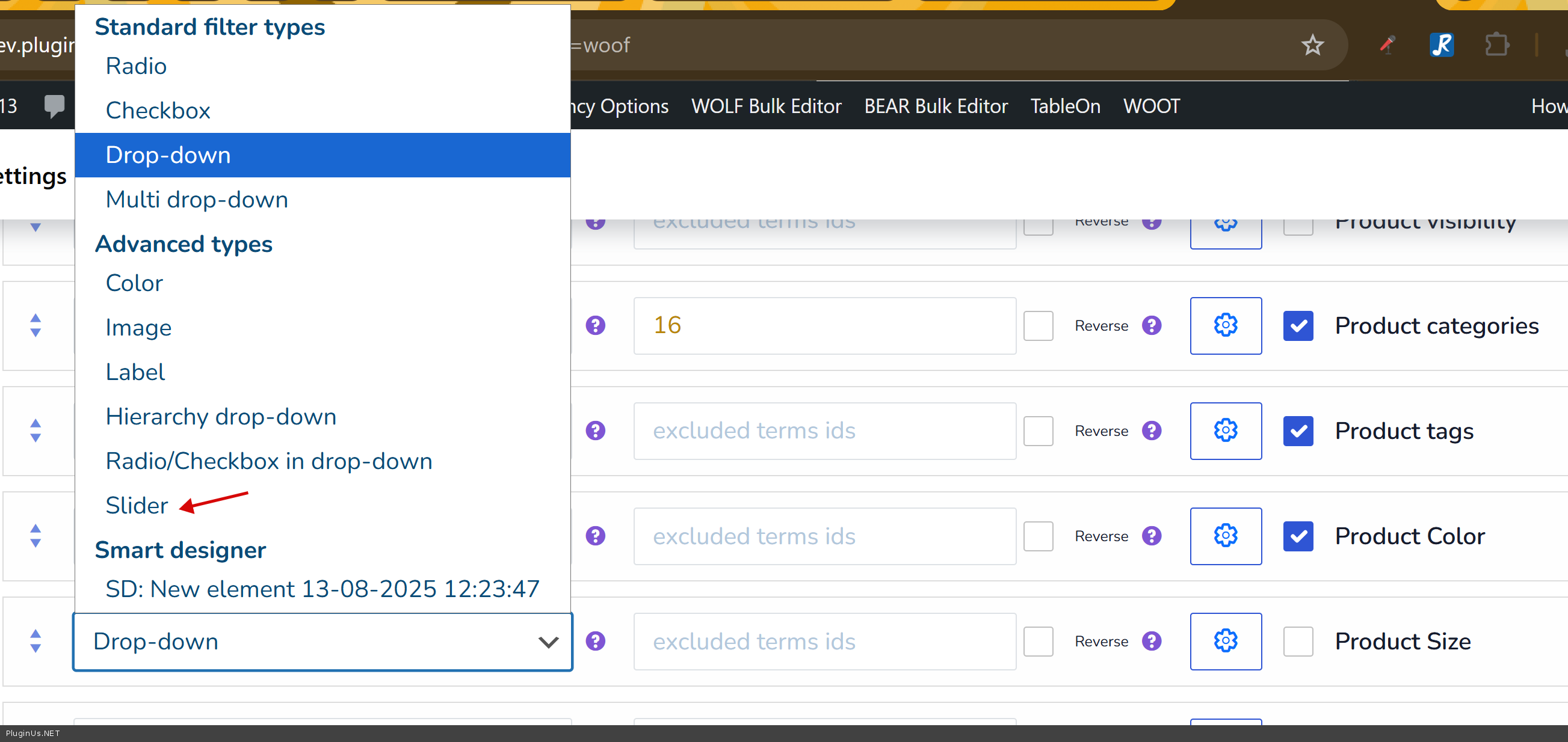 With premium you do not need any custom meta field at all. Just go to HUSKY filter settings, find your pa_niveau attribute in the filter list, and change its display type to Slider. That is it — no renaming, no extra meta, no workarounds. It will work directly with your existing WooCommerce attribute.